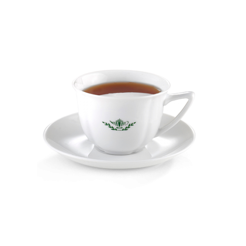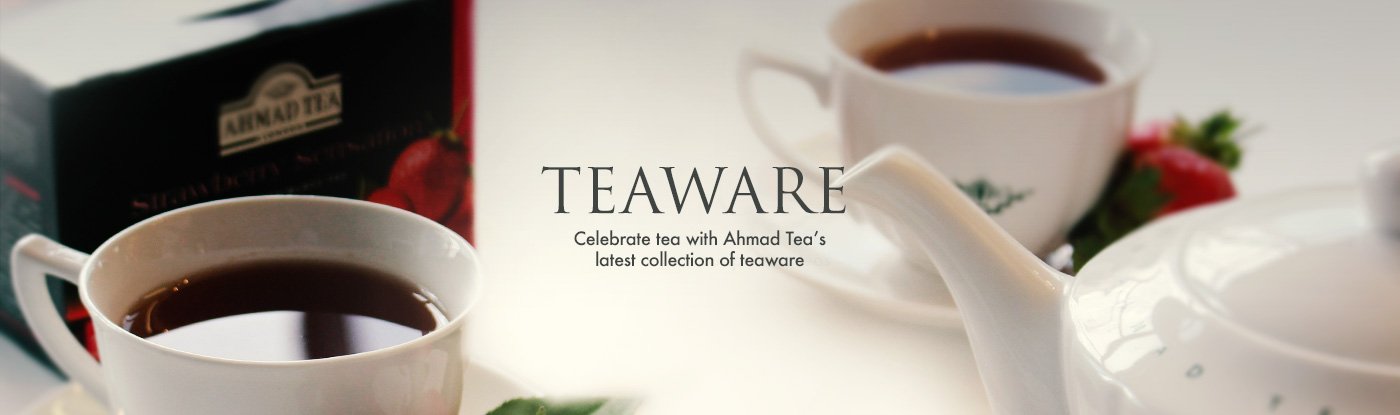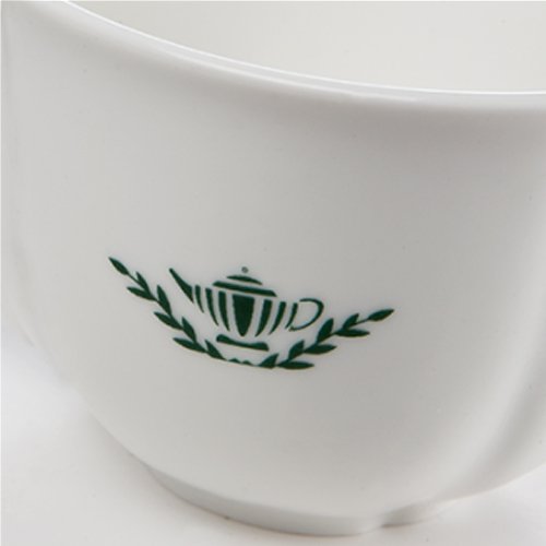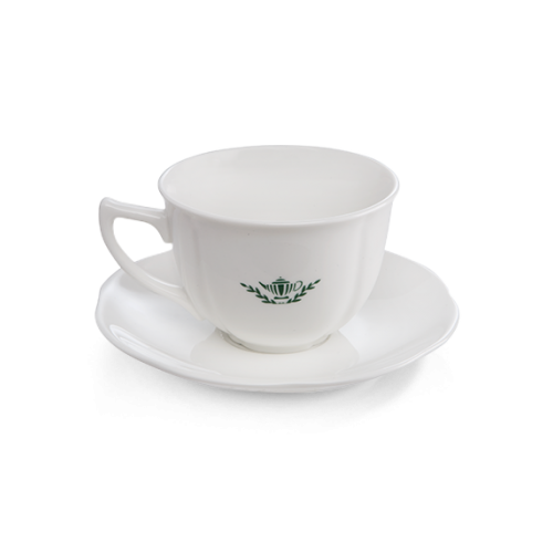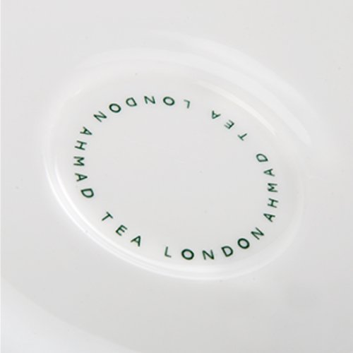 White porcelain teacups and saucers makes teatime far more enjoyable. This uniquely shaped cup with vertical grooves and pointed handle was created just for Ahmad Tea and features our 'teapot and leaf logo' in emerald green on the side of the cup.