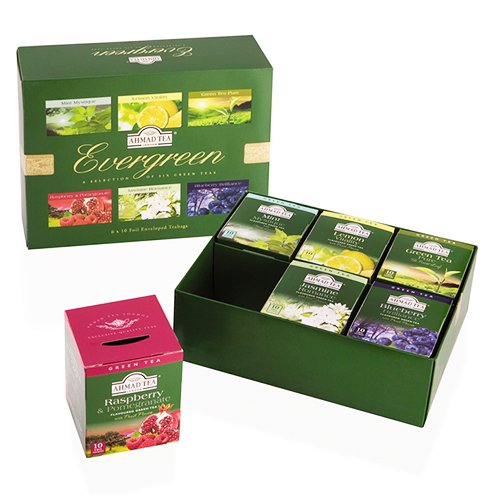 Ahmad Tea Evergreen selection with 6 different kinds of green tea: Green tea, Mint green tea, Jasmine green tea,Lemon green tea, Blueberry green tea and green tea with raspberry and pomegranate.Tea bags with strings, individually foil wrapped, allow preserving the tea ,flavour and aroma.Brewing should take approximately 3-5 minutes.