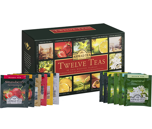 Подарочный набор из 12 разных видов чая : зелёный чай, зелёный чай с мятой, зелёный чай с жасмином, зелёный чай с лимоном, Darjeeling, Earl Grey, Английский чай нр. 1, Английский завтрак, чёрный чай с ароматом лимона и лимон лайма, чёрный чай с ароматом яблока, чёрный чай с ароматом клубники, чёрный чай с ароматом персика и маракуйя. Чай в одноразовых пакетиках с ниткой, в индивидуальной фольгированной упаковке.Настаивать в течении 3-5 минут.